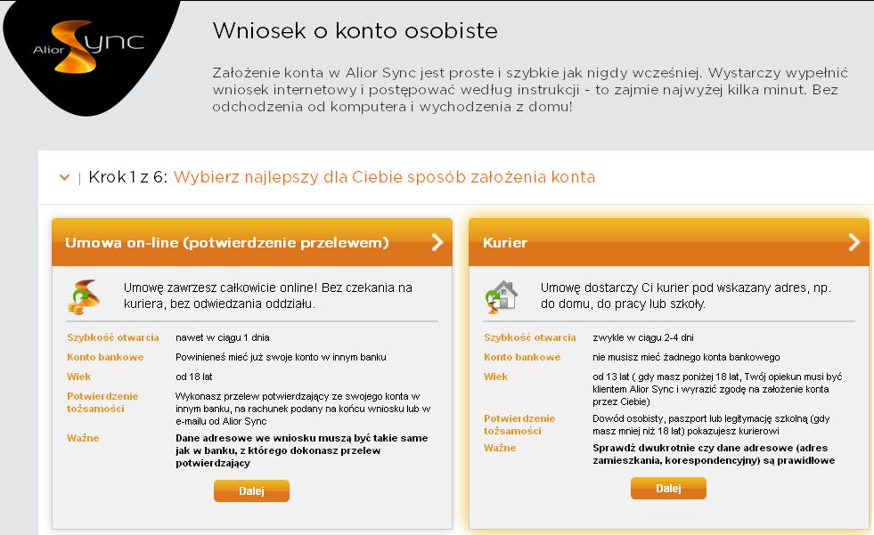 Wybrałem tutaj szybszą opcję (Umowa on-line) z potwierdzeniem danych poprzez przelew z innego banku.
