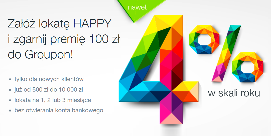 Dzisiaj mam z kolei coś dla nowych klientów Idea Bank. Do zgarnięcia jest aż 100 zł do wykorzystania na Groupon w zamian za otwarcie Lokaty Happy 4%.