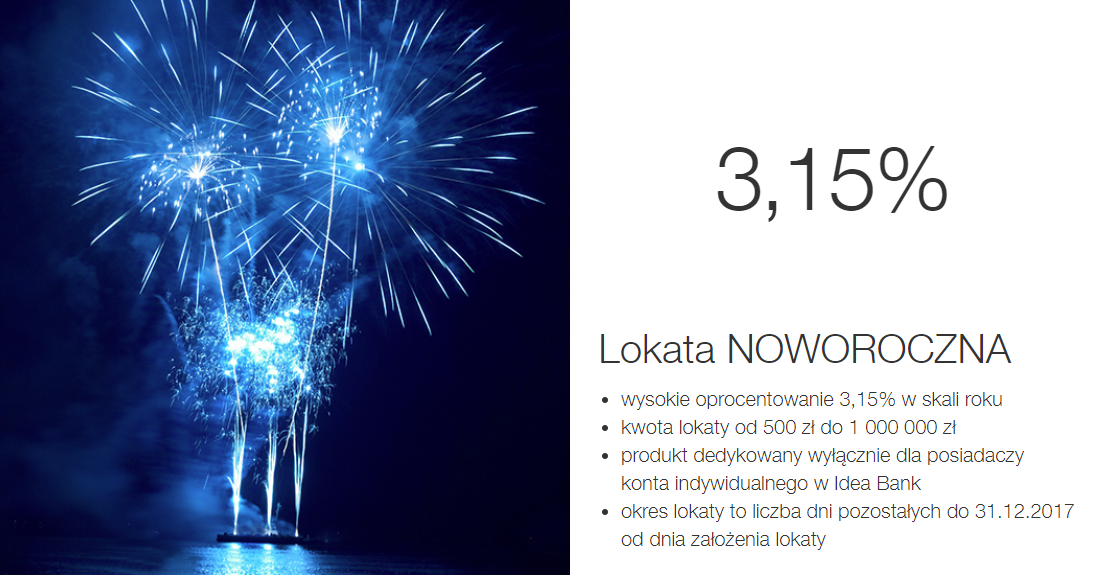 Okres lokaty Noworocznej to liczba dni pozostałych do 31.12.2017 r. Lokata dostępna jest dla posiadaczy kont osobistych Idea Bank.