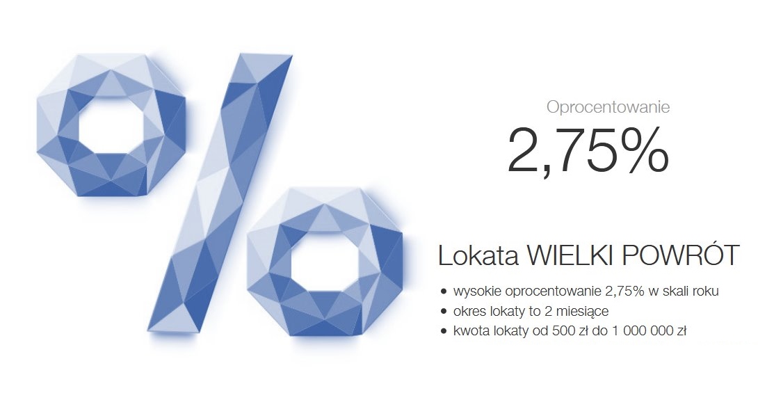 Lokata Wielki Powrót oprocentowana jest na 2,75% w skali roku na okres 2 miesięcy. Co najważniejsze, lokata dostępna jest dla wszystkich, bez warunków dodatkowych.