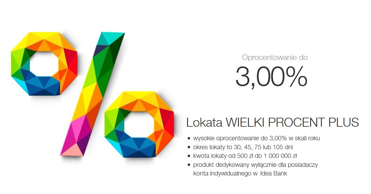 Lokata Wielki Procent Plus na 2,7 – 3% dla osób posiadających konto w Idea Bank