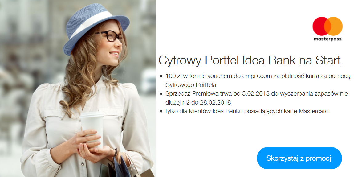 Idea Bank z okazji wprowadzenia nowej usługi ruszył z promocją, dzięki której otrzymać można 100 zł na empik.com w zamian za założenie portfela MasterPass i wykonanie transakcji na kwotę min. 100 zł.