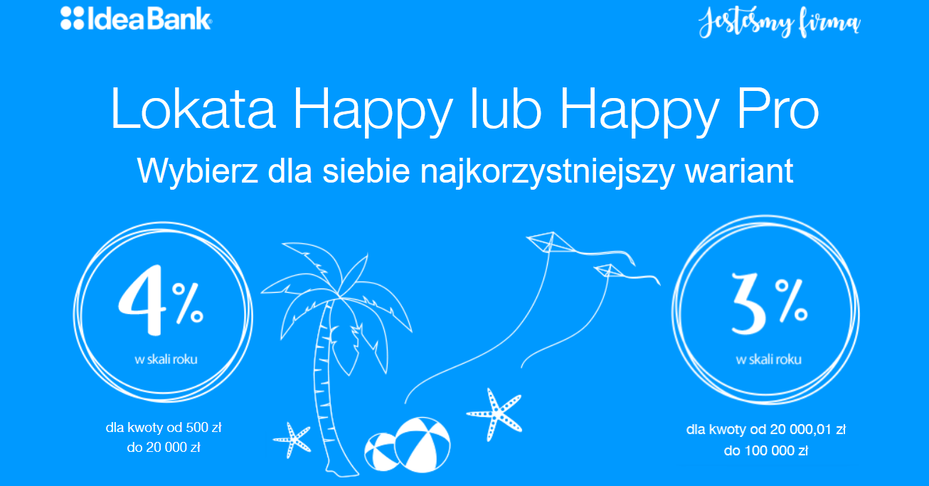 Idea Bank uprościł ofertę lokat dla nowych klientów. Z oferty wycofana została Lokata Happy Plus a jednocześnie została podwyższona kwota maksymalna dla sztandarowej Lokaty Hapyy 4% do 20 000 zł.