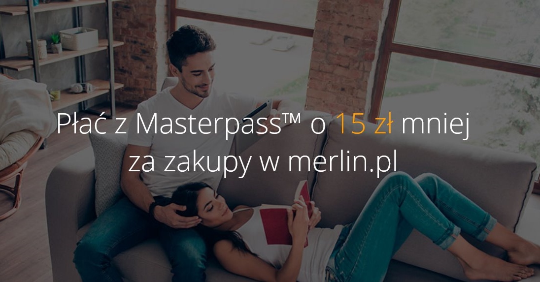 W sklepie Merlin.pl trwa prosta promocji, dzięki której otrzymamy 15 zł zniżki na biężące zamówienie w zamian za zakupy za minimum 49 zł i płatność kartą Mastercard lub Maestro za pomocą elektronicznego portfela Masterpass.