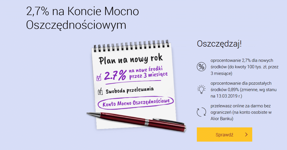 Konto Mocno Oszczędnościowe na 2,7% w skali roku do 100 000 zł w Alior Bank