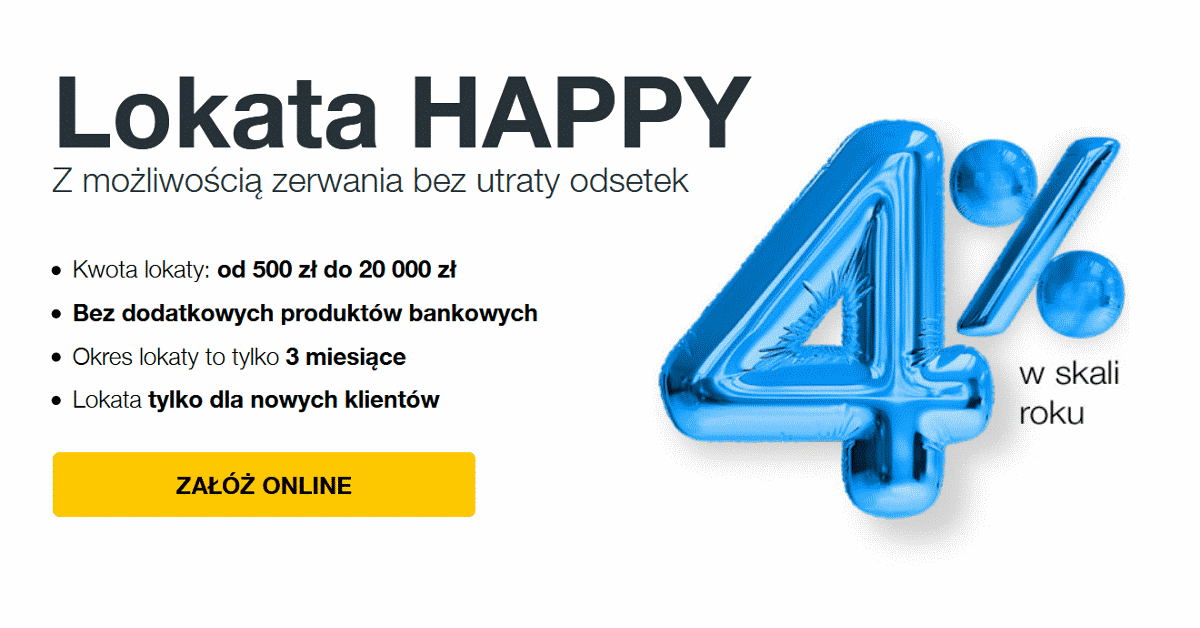 Lokata Happy jest obok Nest Lokaty Witaj na najwyżej oprocentowaną lokatą na rynku. Zarobimy na niej 4% w skali roku.