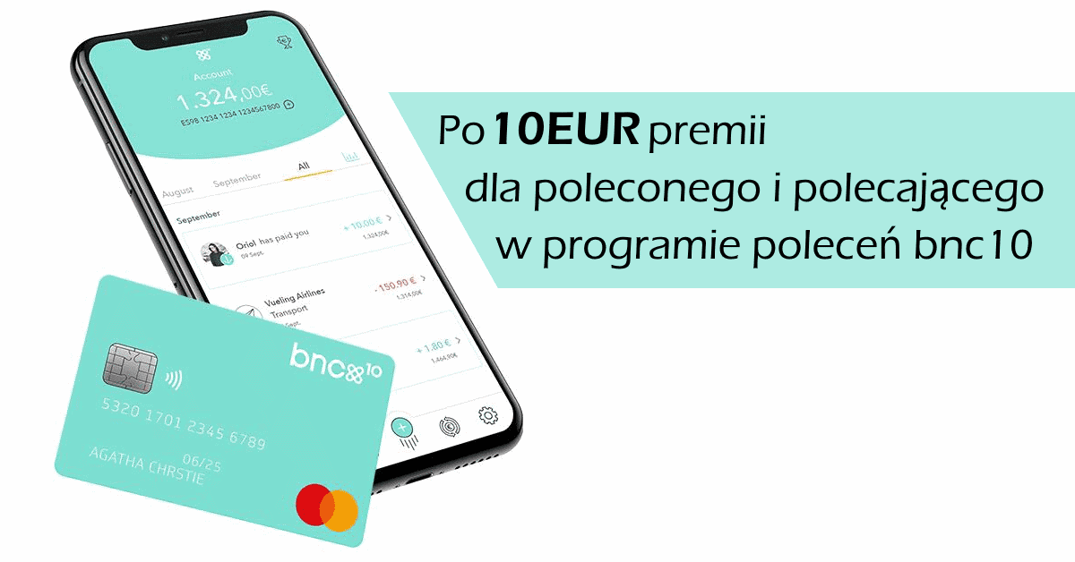 Bnc10 jest hiszpańskim fintechem zbliżonym funkcjonalnością do opisywanego już na łamach bloga Monese z premią 20 GBP na start.