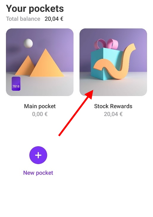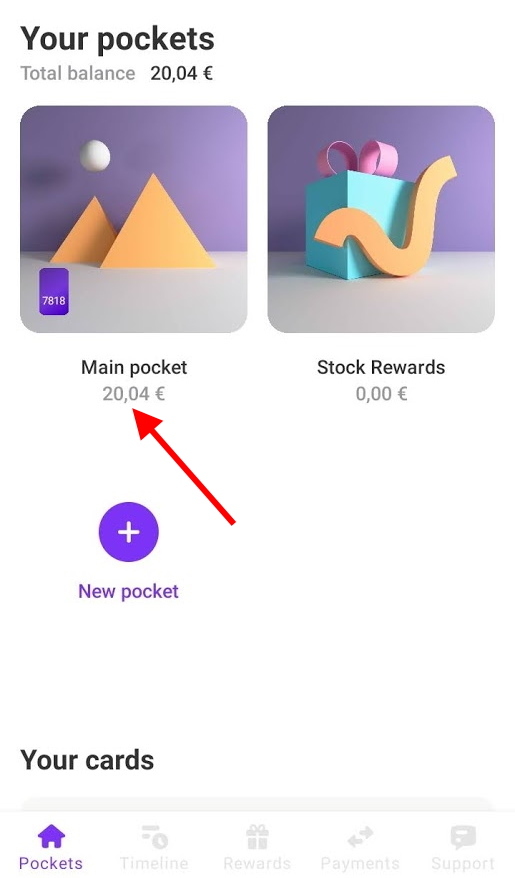 Po tej operacji całe środki znajdują się już w głównym portfelu „Main pocket” i możemy przejść do doładowania konta Revolut za pomocą karty Vivid kwotą widniejącą w głównym portfelu.