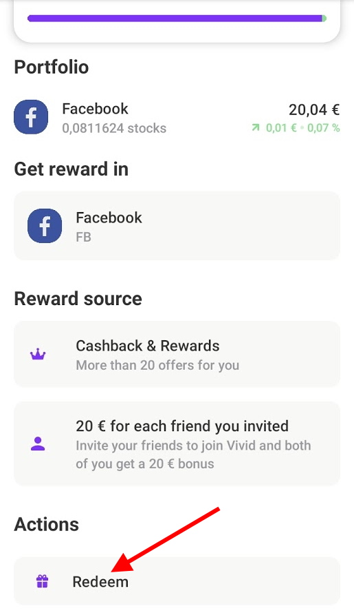 Pierwszym krokiem będzie zalogowanie się w aplikacji Vivid i kliknięcie kafla „Stock Rewards”. Tutaj trzeba wybrać jedną ze spółek, np. Facebook, Amazont, itp.