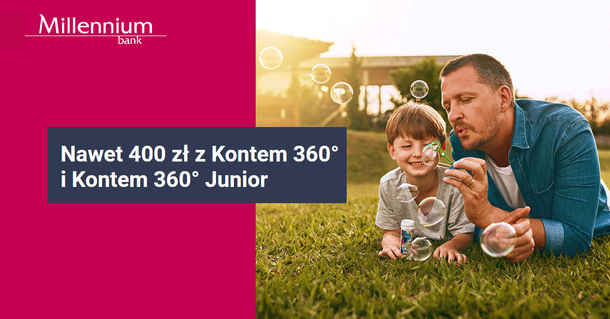 Ruszyła nowa promocja Banku Millennium z premią do 400 zł na start, z czego 250 zł otrzymamy za założenie Konta 360° dla siebie, 50 zł za założenie konta dziecku oraz 100 zł za złożenie wniosku w programu Dobry Start 300+.