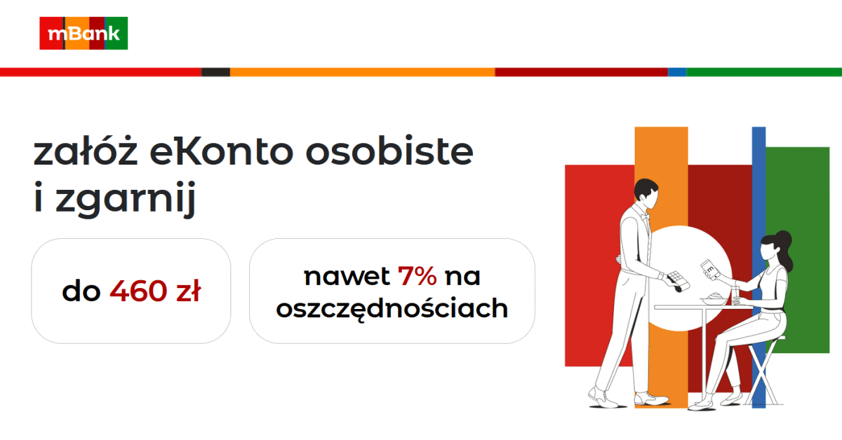 mBank aktywnie promuje swoje konta osobiste. W aktualnej promocji eKonta osobistego wypłaci nowym lub powracającym klientom premię 460 zł na start + możliwością ulokowania oszczędności na 7% w skali roku do 50 tys. zł.