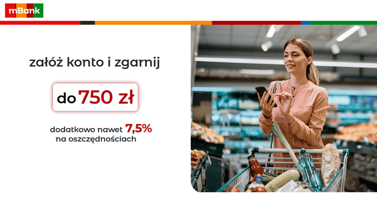 mBank ruszył z nową kumulacją promocji, dzięki której przez krótki czas będzie można zgarnąć rekordowo wysoką premię w wysokości aż do 750 zł, z czego aż 550 zł w gotówce oraz 200 zł w bonach do Biedronki. Akcja dostępna jest dla nowych i powracających klientów. Dodatkowym bonusem jest możliwość ulokowania oszczędności aż na 7,5% w skali roku.