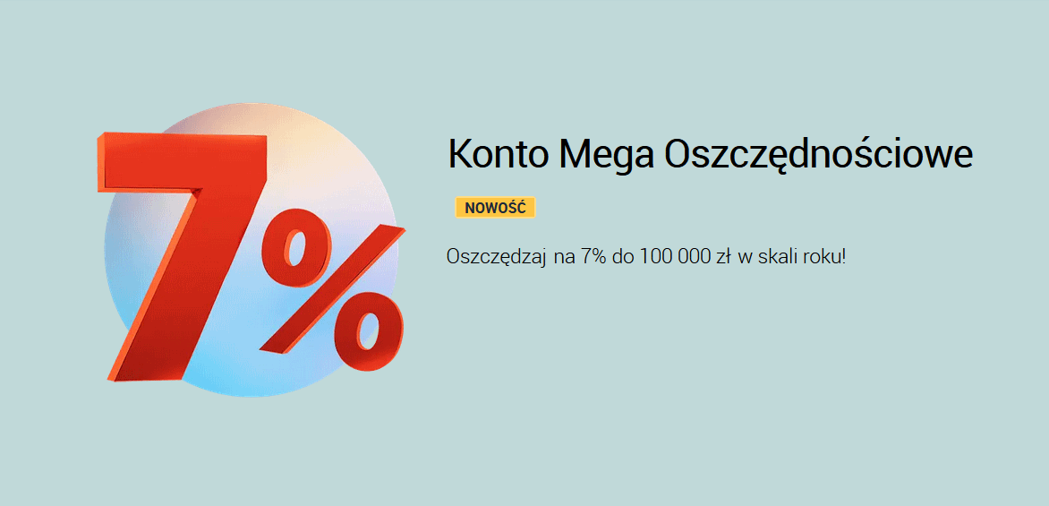 - 7% do 100 tys. zł na koncie Mega Oszczędnościowym dla nowych klientów przez 4 miesiące