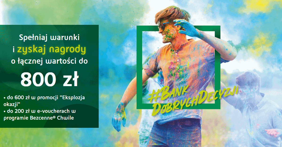BNP Paribas ruszył z nową promocją „Eksplozja okazji”, która w połączeniu z drugą promocją banku da nam zarobić aż 800 zł premii, z czego 600 zł otrzymamy przelewem na konto, a kolejne 200 zł w voucherach programu Mastercard Bezcenne Chwile wymiennych na vouchery do wielu sklepów, w tym m.in. Allegro, Decathlon, RTV EURO AGD, Circle K.
