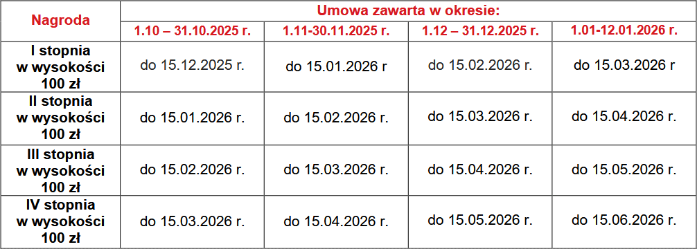 Nagrody zostaną przekazane na konto osobiste otwierane w promocji wg daty jego otwarcia zgodnie z poniższą tabelą: