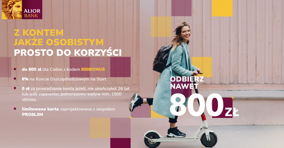 Alior Bank ruszył z nową promocją Konta Jakże Osobistego z wysoką premią 800 zł w gotówce na start za jego założenie i spełnienie warunków promocji . Dodatkowo możemy korzystać ze zwrotu za płatności mobilne (1% moneyback) w wysokości do 240 zł rocznie. Możesz też założyć konta oszczędnościowe na 6% i 5% w skali roku.