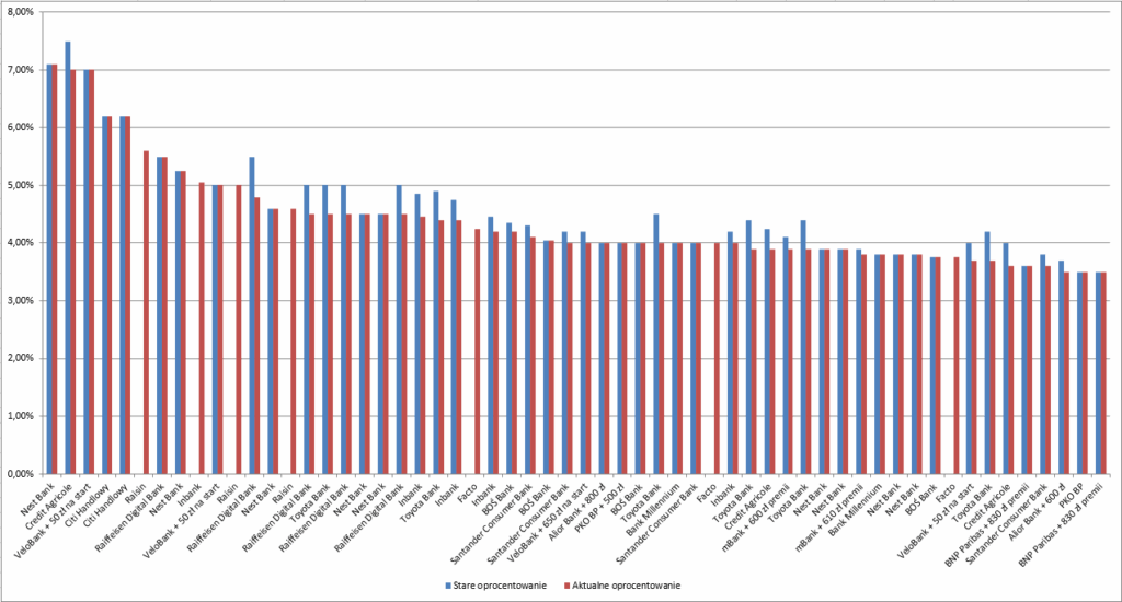 Poniższy wykres słupkowy obrazuje zmianę oprocentowania lokat bankowych w miesięcznym horyzoncie czasowym. Widzimy na nim kilka nowości, zero wzrostów oprocentowania i aż 26 spadków oprocentowania: